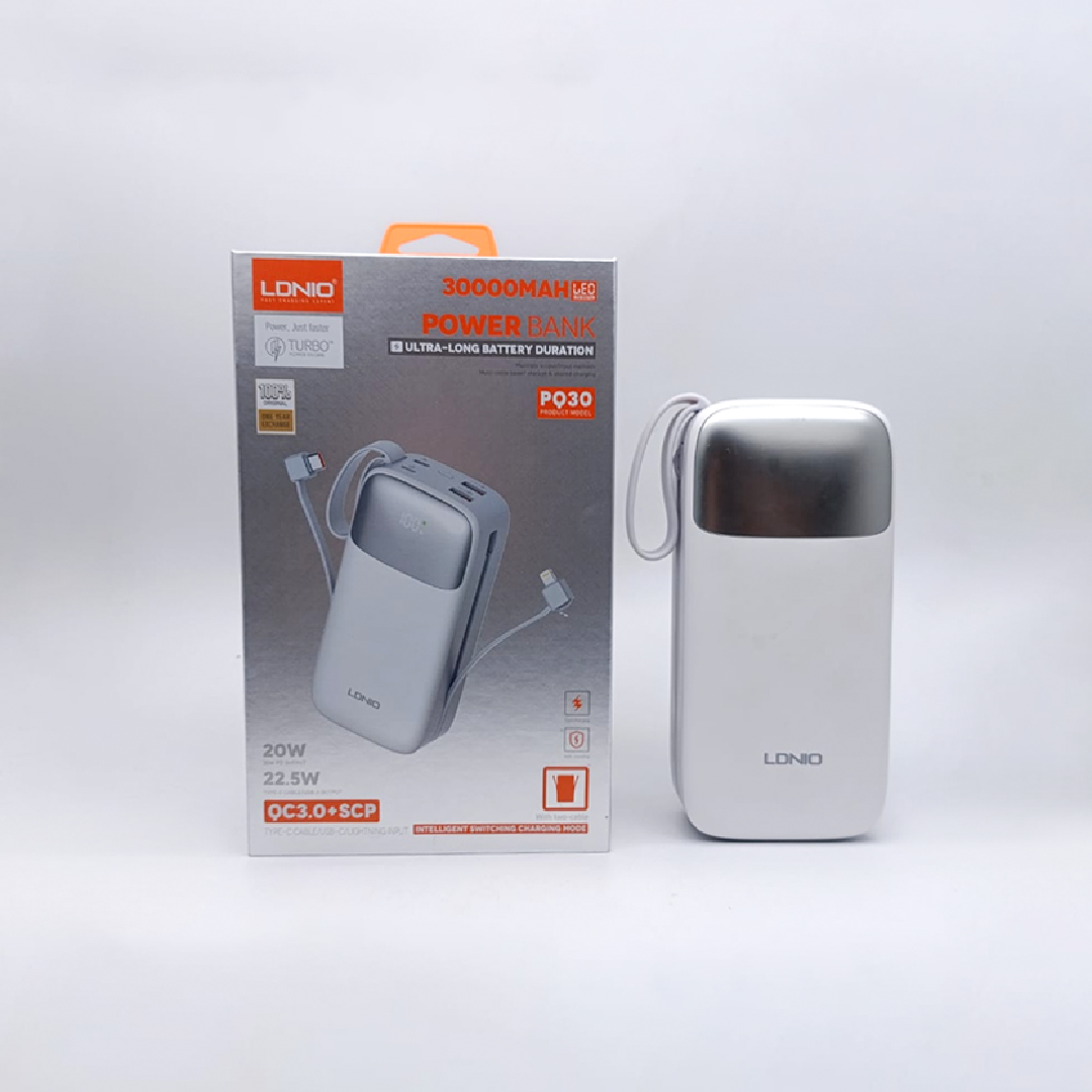 Potencia tu día con el LDNIO PQ30, el power bank de 30000 mAh que nunca te deja sin energía. Con carga rápida de hasta 22.5 W, dos cables integrados (USB-C y Lightning) y múltiples puertos, puedes recargar varios dispositivos a la vez con total comodidad. Su pantalla digital indica el nivel de batería y su tecnología Quick Charge 3.0 + SuperCharge Protocol garantiza una carga veloz y segura